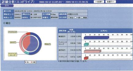 ・1運行の運行状態を「アイドリング時間」、「等速走行時間」、「アイドリングストップ時間」、波状走行時間」の項目に分類し比率を円グラフと帯グラフで表現します。