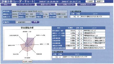運転者別運行実績表画面で選択した運行の安全運転経済運転の各評価項目をレーダーチャート形式で表示します。